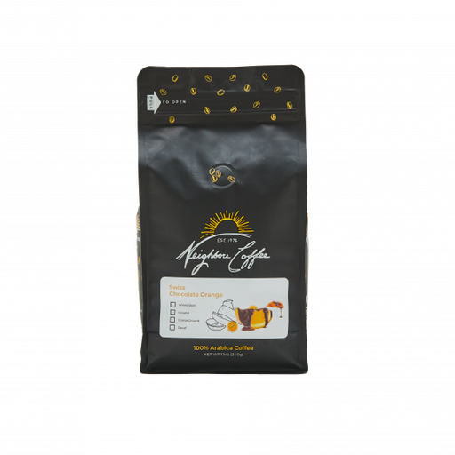 Neighbors CoffeeA unique combination of Swiss Chocolate and Orange essence mixed with dried orange peel!