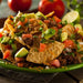 In a medium pot prepare Southwest Queso Hot Dip Mix as directed. Stir in ground meat until well combined. Pour mixture over chips and top with shredded cheese. Serve warm!